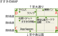 >A 南5条より北、駅前通りより東のお店 >B 南5条より南、駅前通りより東のお店 >C 南5条より南、駅前通りより西のお店 >D 南5条より北、駅前通りより西のお店 |